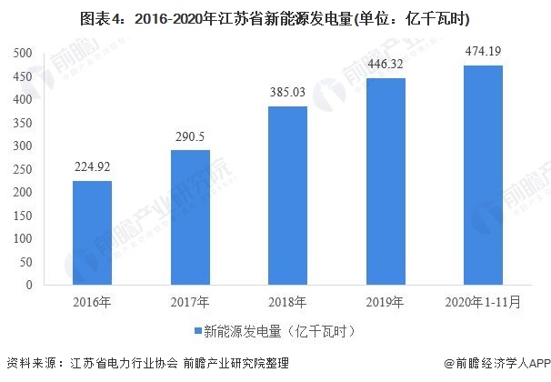 2020年1-11月份,江蘇全省發(fā)電量4533.71億千瓦時,其中新能源發(fā)電量474.19億千瓦時,占全省發(fā)電量的10.46%,份額占比進(jìn)一步提升。