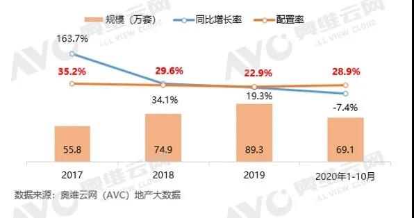 根據(jù)奧維云網(wǎng)地產(chǎn)大數(shù)據(jù)監(jiān)測(cè)顯示:2020年1-10月,新風(fēng)系統(tǒng)配套規(guī)模近70萬(wàn)套,同比降幅7.4%。雖然精裝市場(chǎng)規(guī)模出現(xiàn)下滑,但是新風(fēng)系統(tǒng)在精裝修市場(chǎng)的配套率卻穩(wěn)步上升,見(jiàn)圖2。目前新風(fēng)系統(tǒng)已經(jīng)屬于二級(jí)配套部品,預(yù)計(jì)未來(lái)配套率可達(dá)到70%,在精裝修、高端住宅、養(yǎng)老社區(qū)以及舊房改造中仍然有很大的市場(chǎng)潛力。