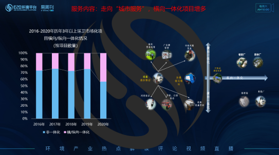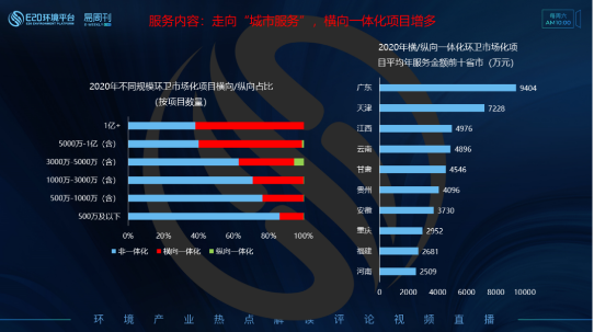 2020年對于環(huán)衛(wèi)市場而言,“城市管家”、“大市政綜合管養(yǎng) ”、“城市服務(wù)”等關(guān)鍵詞頻出,這類項(xiàng)目往往涵蓋環(huán)衛(wèi)、道路養(yǎng)護(hù)、城市路燈、河道管理、園林綠化、公園管護(hù)等多項(xiàng)服務(wù)。E20研究院將此類項(xiàng)目定義為環(huán)衛(wèi)市場化的橫向一體化項(xiàng)目。將傳統(tǒng)環(huán)衛(wèi)與城市管養(yǎng)的多項(xiàng)服務(wù)進(jìn)行一體化打包,全區(qū)域覆蓋、全流程作業(yè)、精細(xì)化管理,可以適度提升市政、環(huán)衛(wèi)、綠化管護(hù)的水平和質(zhì)量,2020年趨勢更為明顯(左圖)。