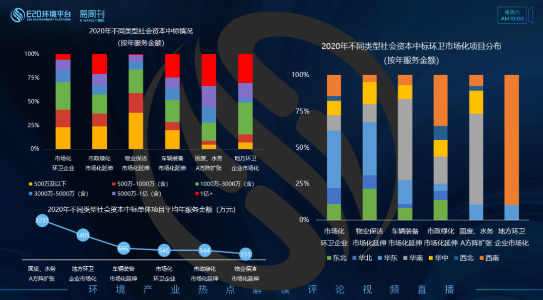 左上圖:物業(yè)保潔類企業(yè)很大一部分環(huán)衛(wèi)市場化份額來源于年服在500萬及以下的小項(xiàng)目;固廢、水務(wù)A方陣擴(kuò)張和地方環(huán)衛(wèi)企業(yè)市場化部分所占市場份額大多來源于年服務(wù)金額在500萬以上的環(huán)衛(wèi)市場化項(xiàng)目,尤其是年服務(wù)金額過億元的環(huán)衛(wèi)市場化項(xiàng)目。左下圖顯示了2020年不同類型社會資本中標(biāo)單體項(xiàng)目平均年服務(wù)金額情況,和左上圖保持一致,固廢、水務(wù)A方陣擴(kuò)張和地方環(huán)衛(wèi)企業(yè)市場化部分企業(yè)所拿到的項(xiàng)目體量較大,而物業(yè)保潔市場化延伸類企業(yè)所拿到的項(xiàng)目平均年服務(wù)金額最低。