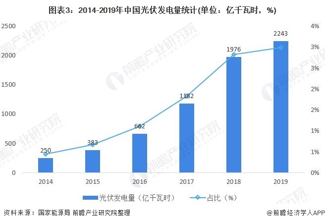 從我國光伏發(fā)電量上看,2014以來,中國光伏發(fā)電量呈逐年上升趨勢(shì),占總發(fā)電量比重逐年上升。2019年,全國光伏發(fā)電量2243億千瓦時(shí),同比增長13.3%,約占總發(fā)電量的3%。