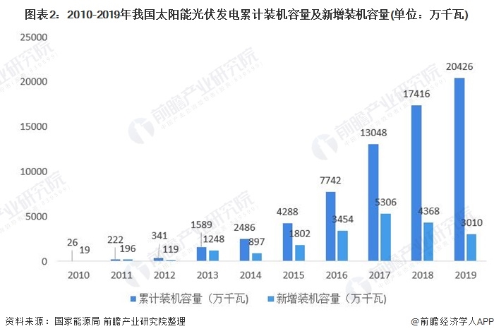 從累計(jì)裝機(jī)容量上看,2010年以來,我國太陽能光伏發(fā)電累計(jì)裝機(jī)容量逐年上升。從新增裝機(jī)容量上看,2010-2017年,我國太陽能光伏發(fā)電新增裝機(jī)容量逐年上升,2018年與2019年開始下降。
