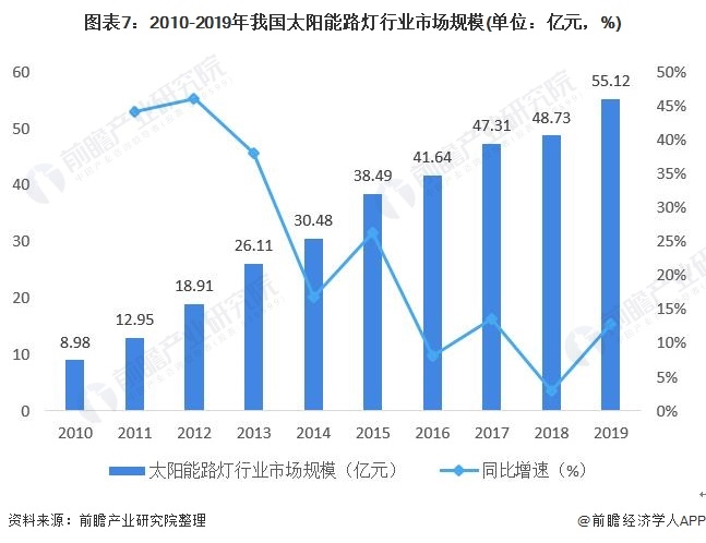 以我國太陽能照明中占比較大的太陽能路燈為例。太陽能路燈可以降低照明用電量,是節(jié)省能源的重要途徑。受“綠色照明工程”的推動(dòng),近年來我國太陽能路燈市場(chǎng)一直保持增長,2019年我國太陽能路燈市場(chǎng)規(guī)模達(dá)到55.12億元,同比增長12.86%。