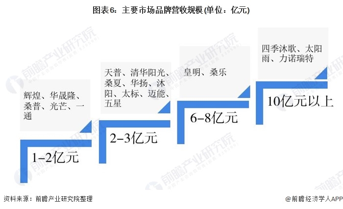 隨著大批太陽能企業(yè)的相繼倒閉和退出,太陽能熱水器市場(chǎng)份額進(jìn)一步向大中品牌靠攏,品牌格局日漸明晰。目前,我國太陽能熱水器企業(yè)逐步形成四個(gè)梯隊(duì),其中,日出東方旗下?lián)碛刑栍旰退募俱甯鑳纱笃放埔约傲χZ瑞特等三家太陽能熱水器代表企業(yè)處于第一梯隊(duì),營收規(guī)模均達(dá)10億元以上。