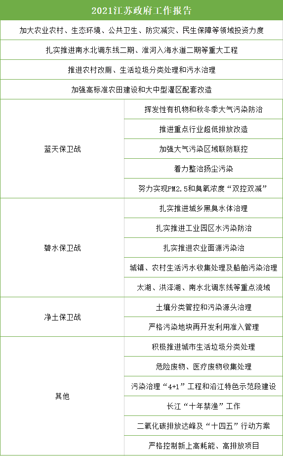 2021年,江蘇經(jīng)濟社會發(fā)展主要預期目標包括:單位地區(qū)生產(chǎn)總值能耗降低3%左右,生態(tài)環(huán)境質(zhì)量持續(xù)好轉,主要污染物排放完成國家下達的目標任務。