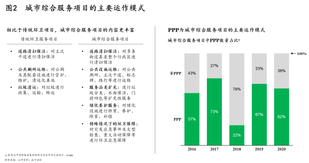 其二,PPP模式的采用,利用社會資本解決環(huán)衛(wèi)一體化項目的資金難題成為可能。相比于傳統(tǒng)環(huán)衛(wèi)項目,城市綜合服務(wù)項目的內(nèi)容更為豐富,對資金的要求也相應(yīng)提升,PPP模式的應(yīng)用為有效盤活現(xiàn)有環(huán)衛(wèi)資產(chǎn)提供思路,其也成為城市綜合服務(wù)項目的主要運作模式,催生新一批的環(huán)衛(wèi)大單(如圖2)。