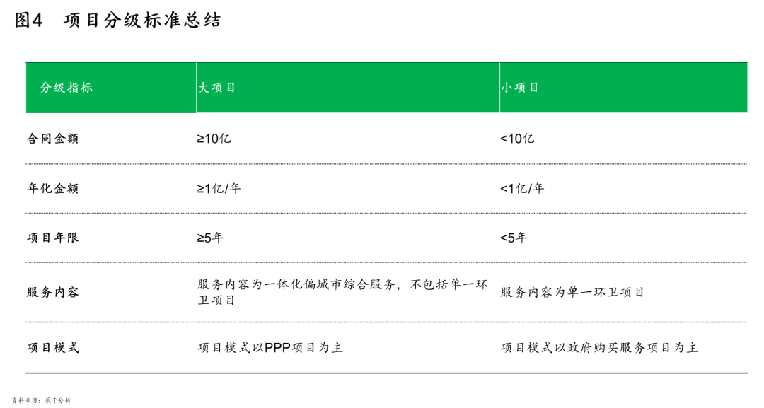 基于已有項目數(shù)據(jù),辰于從合同金額、年化金額、項目年限、服務(wù)內(nèi)容、項目模式這五個分級標(biāo)準(zhǔn)對“大項目”進行界定區(qū)分(如圖4)。一般而言,滿足以下條件之一的環(huán)衛(wèi)項目即可稱為“大項目”:合同金額在10億以上;年化金額在1億以上;合作年限在5年以上。