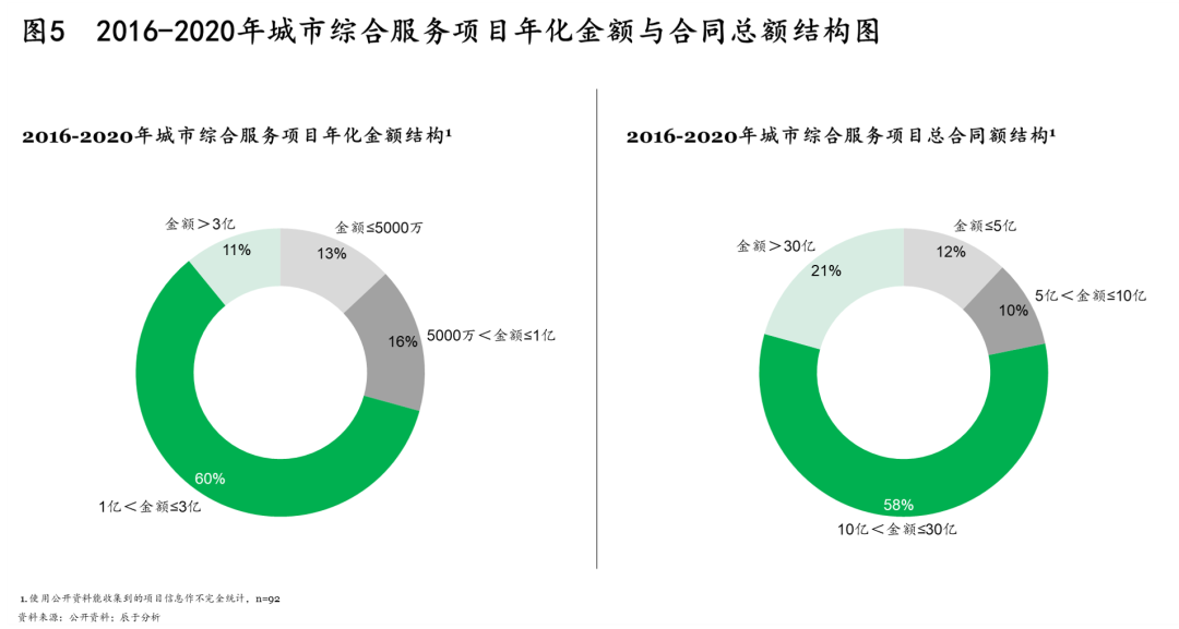 這類項目有助于企業(yè)快速形成規(guī)模與優(yōu)勢,是環(huán)衛(wèi)企業(yè)制勝未來的首要選擇。從2016-2020年城市綜合服務(wù)項目年化金額及合同總額結(jié)構(gòu)圖中可以看出,大項目的年化金額與合同總額均占7成以上,因此相比爭奪數(shù)量多但金額少的小項目,獲得大項目對企業(yè)增收的意義更為突出(如圖5)。