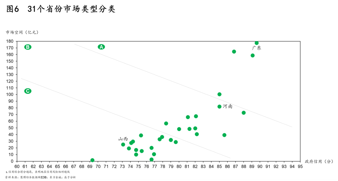 環(huán)衛(wèi)大單的產(chǎn)生不僅需要足夠的市場空間,而且需要當(dāng)?shù)卣休^強的財政支付能力,辰于采用市場空間和政府信用雙維度分析,建立以環(huán)衛(wèi)大單為目標(biāo)的區(qū)域評估模型(如圖6)。其中,東部省份(如廣東等)市場空間大,足以孕育出足夠的大金額項目,且政府信用相對較好,財政支付能力強,債務(wù)風(fēng)險低。關(guān)注大單的企業(yè)可以在該類地區(qū)多拿項目,并與政府保持密切的溝通和聯(lián)系,通過集群效應(yīng)、中心輻射效應(yīng),與政府合力催生出大項目。