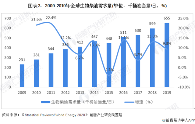據(jù)Bp公布的《Statistical Review of World Energy 2020》數(shù)據(jù),2009-2019年期間全球生物柴油日需求量呈不斷增長態(tài)勢,從2009年的231千桶油當(dāng)量/日增至2019年的655千桶油當(dāng)量/日,年均增長11%。