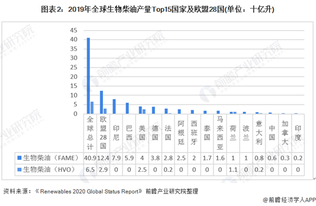 2019年全球生物柴油(FAME)產(chǎn)量為409億升,生物柴油(HVO)產(chǎn)量為70億升