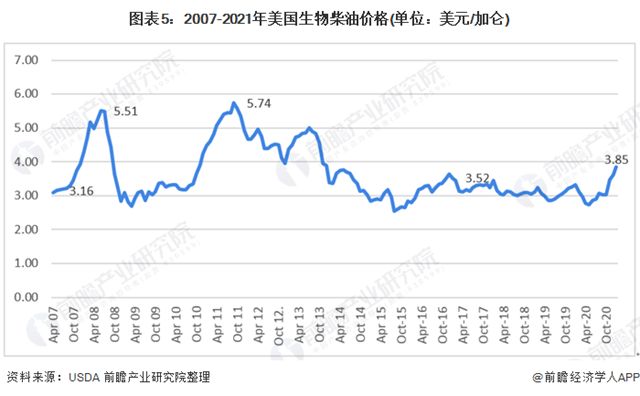 以美國生物柴油價格為例,2007-2021年美國生物柴油價格較為波動。近年來,美國生物柴油價格基本穩(wěn)定在2.5-4美元/加侖之間,2020年3月至2021年1月在疫情影響下美國生物柴油價格呈波動上漲態(tài)勢,截至2021年1月美國生物柴油價格增至3.85美元/加侖。