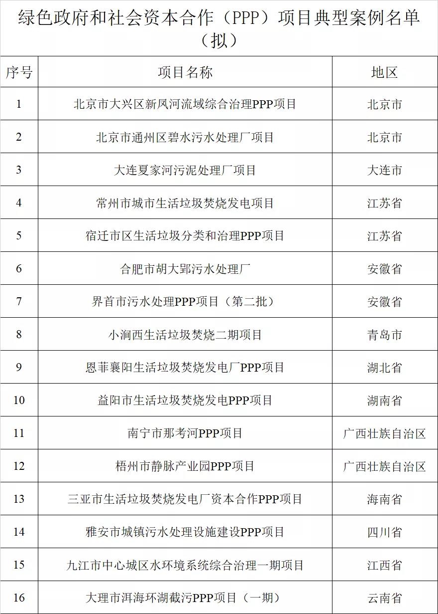 綠色政府和社會資本合作(PPP)項(xiàng)目典型案例名單公示
