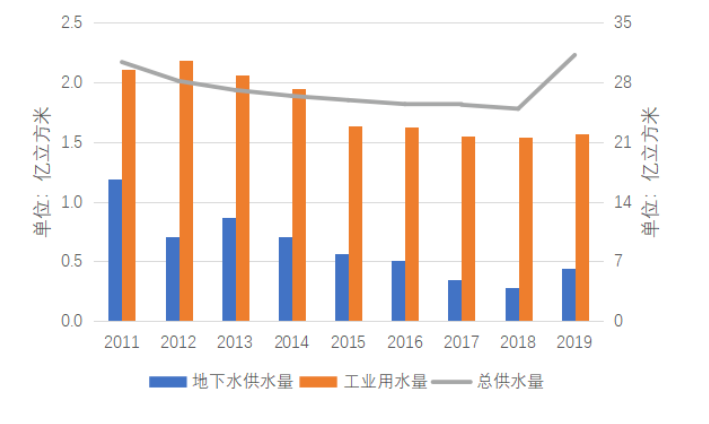 圖 2 2011-2019年宿遷市地下水供水量與工業(yè)用水量變化