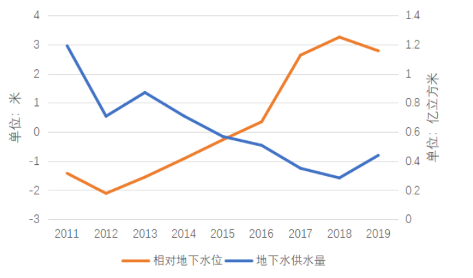 圖 3 2011-2019年宿遷市相對地下水位與年地下水供水量變化