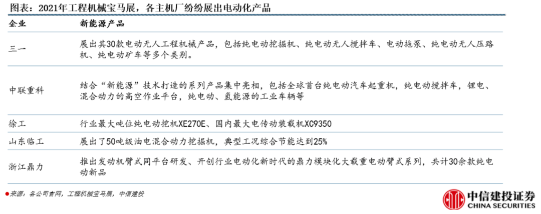 工程機(jī)械龍頭企業(yè)在電動化領(lǐng)域研發(fā)實力更強(qiáng),布局更早,將引領(lǐng)行業(yè)進(jìn)步與變化,重點推薦三一重工、中聯(lián)重科、徐工機(jī)械。