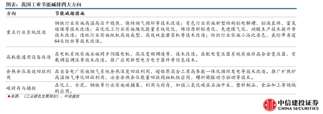 在碳達(dá)峰的背景下,我國工業(yè)將加快節(jié)能減排改造。從具體措施來看,我國工業(yè)節(jié)能減排主要通過傳統(tǒng)工業(yè)領(lǐng)域系統(tǒng)改造、高耗能通用設(shè)備改造、余熱余壓高效回收利用、碳封存與捕捉等措施來實現(xiàn)節(jié)能減排。