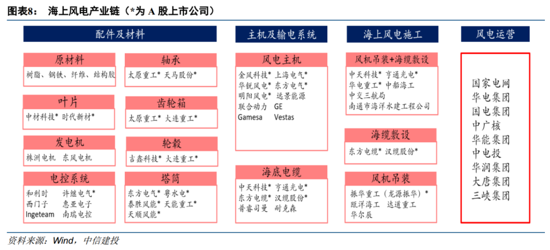 風(fēng)電產(chǎn)業(yè)鏈:風(fēng)電行業(yè)產(chǎn)業(yè)鏈主要包括原材料企業(yè)、零部件制造商、風(fēng)電整機(jī)制造商、風(fēng)電運(yùn)營商四大環(huán)節(jié)。