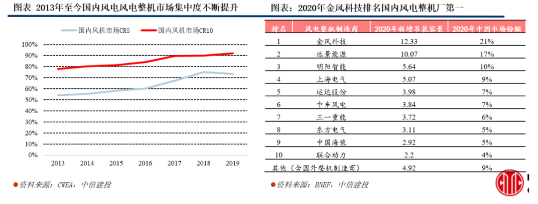 國內(nèi)風(fēng)電整機(jī)市場(含原材料及零部件)規(guī)模超千億,行業(yè)集中度高。從風(fēng)電場資本開支構(gòu)成來看,國內(nèi)風(fēng)電整機(jī)市場(含原材料及零部件)規(guī)模超千億元。風(fēng)電場資本開支由風(fēng)電整機(jī)、系統(tǒng)平衡(電氣基礎(chǔ)設(shè)施、組裝和安裝)以及財務(wù)費用(保險、建筑融資等)組成,其中陸地風(fēng)電場資本開支中風(fēng)電整機(jī)投入占比約65-70%,以此推算,國內(nèi)風(fēng)電整機(jī)市場(含原材料及零部件)規(guī)模超千億元。重點推薦風(fēng)電整機(jī)龍頭金風(fēng)科技。