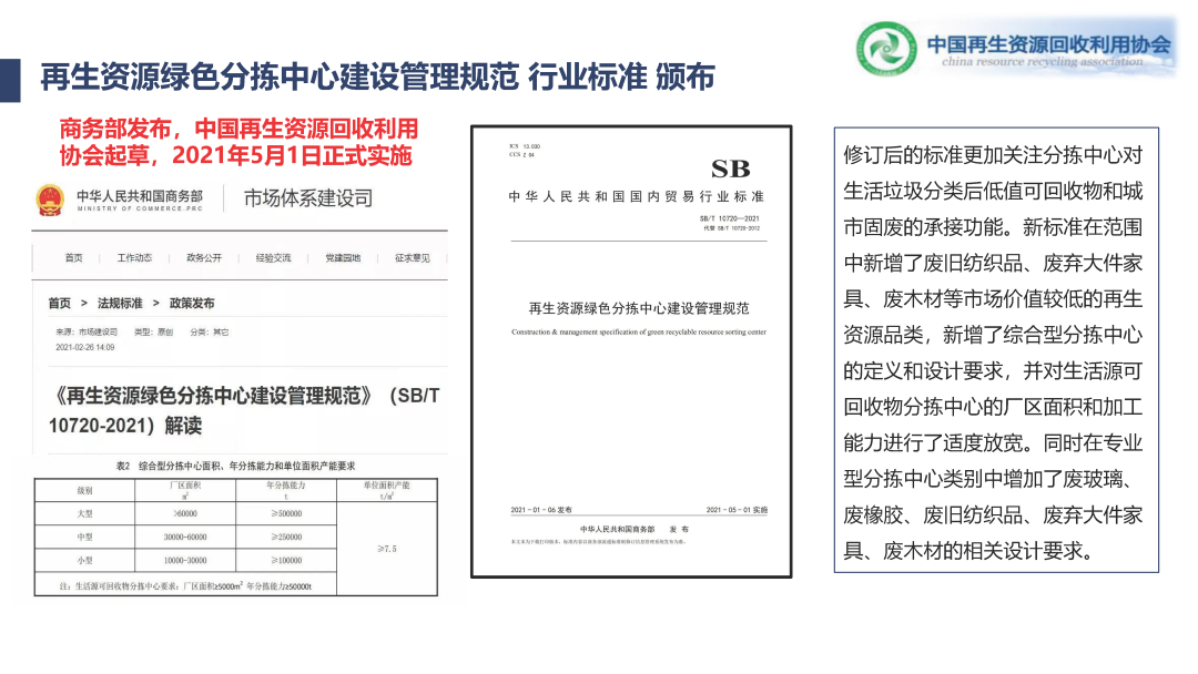 我們特意強調了一下,修了三年,這個標準今年終于發(fā)布了。一出來社會反響特別大,關注分揀中心的合規(guī)性,一定要讓規(guī)范的企業(yè)沖到市場主體,去承擔相應的體系建設的任務,所以酒吧相應的標準強調了,也增加了生活源分類后回收物去承接的功能。就是把再生資源分揀中心完全打造成服務于城市固廢服務一個重要的節(jié)點,這是一個很重要的標準,也是我們做了三年的一個結果。
