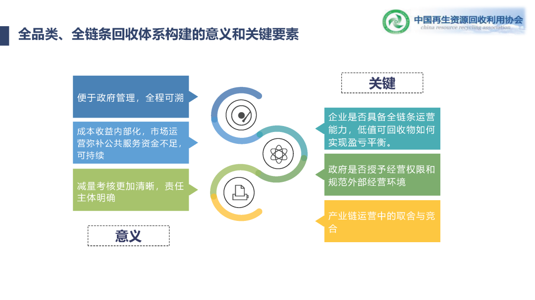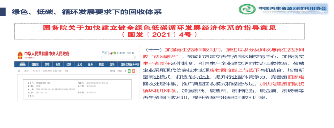 剩下幾個,一個就是生產(chǎn)者責任延伸,一個就是家電,還有回收的模式,線上線下結合,包括加強循環(huán)利用,我讀了十一條之后,都點到了,我個人理解它是從體系建設來抓,每句話說的都是怎么樣健全完善資源回收的體系,從體系的角度去講的,而不是前幾年打造基地,打造園區(qū),打造回收站點,現(xiàn)在是說從體系建設上來提高它的資源回收利用率。