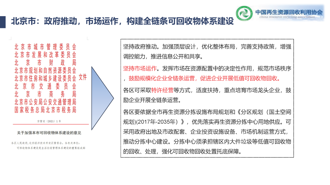 后面想跟大家分享的就是各地方政府在推動全鏈條回收體系建設的一些舉措,我們最熟悉北京,我們跟蹤北京跟蹤了四五年的服務。北京市今年了一號文,題目就是加強本市可回收物體系建設的意見,我們張主任特別清楚,天天市里面都在想辦法貫徹這個文件,抓各區(qū)的體系建設。