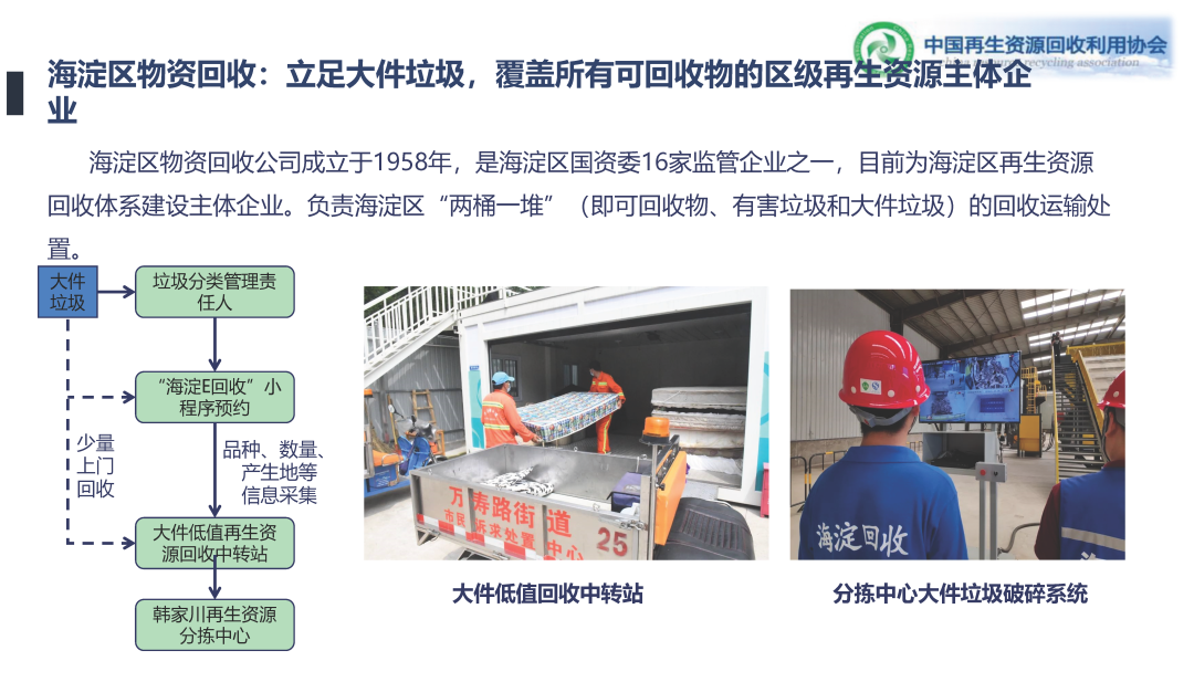 海淀物回是海淀區(qū)的國企,他現(xiàn)在的模式是只收低值。他原來末端有分揀中心的,現(xiàn)在他做物業(yè)經(jīng)營的分揀中心,自己直接運營,就做低值大件。低值大件體系建起來以后,可以往上附加其他的可回收物了。但低值這兒是由區(qū)政府兜底,給他相應的財政補貼。