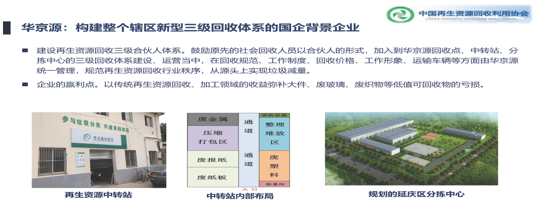 在北京有兩家企業(yè)很有名,就是行業(yè)內的,現(xiàn)在在做整個體系的,一個是華京源,也是我的一個兄弟單位,中國再生資源公司下屬的子公司,他傳統(tǒng)就是做末端分揀中心經(jīng)營的,這四五年在前端做。現(xiàn)在在北京延慶區(qū)、通州區(qū)、豐臺區(qū)包括西城一部分都是華京源在做主體企業(yè),建立了三級回收體系。從它社區(qū)的分類驛站開始布,然后到中轉站,到末端的分揀中心,全鏈條的在運營,而且高值低值都收。就是我們剛才說的這種模式,但是華京源面臨很多問題,企業(yè)已經(jīng)提前支付了太多的成本。