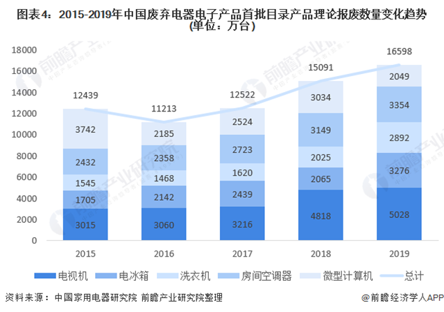 從數(shù)量上看,2015-2019年,我國電視機、電冰箱、洗衣機、房間空調器理論報廢數(shù)量整體呈上升趨勢,微型計算機理論報廢量波動較大。2019年中國電視機理論報廢數(shù)量5028萬臺;房間空調器理論報廢數(shù)量3354萬臺;電冰箱理論報廢數(shù)量3276萬臺;洗衣機理論報廢數(shù)量2892萬臺;微型計算機理論報廢數(shù)量2049萬臺。