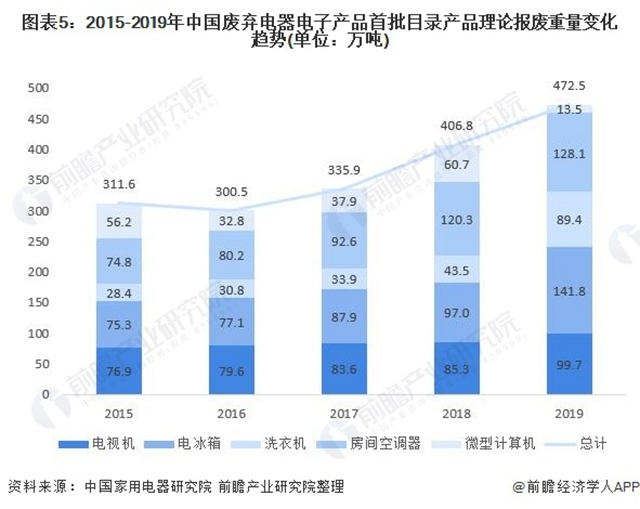 2019年,我國電視機、電冰箱、洗衣機、房間空調器、微型計算機理論報廢重量分別為99.7萬噸、141.8萬噸、89.4萬噸、128.1萬噸、13.5萬噸。
