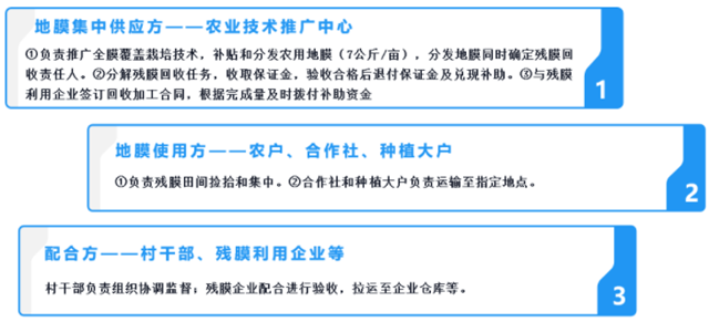 該模式中,主要涉及三方:地膜集中供應方——農(nóng)業(yè)技術推廣中心;地膜使用方——農(nóng)戶、合作社、種植大戶;配合方——村干部、殘膜利用企業(yè)等。具體責任分工如下: