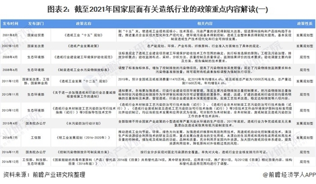 目前,我國造紙工業(yè)企業(yè)6640家,紙及紙板產(chǎn)量與消費量均超過1億噸,位居世界前列,已成為世界造紙工業(yè)生產(chǎn)、消費和貿(mào)易大國。但在發(fā)展過程中也面臨著資源約束、環(huán)境壓力等一系列問題,為了建設(shè)我國特色造紙產(chǎn)業(yè),推進行業(yè)綠色發(fā)展,我國政府制定了諸多產(chǎn)業(yè)發(fā)展政策,以求建立公平的市場秩序和良好的發(fā)展環(huán)境,解決造紙產(chǎn)業(yè)發(fā)展中存在的問題,指導(dǎo)造紙行業(yè)健康發(fā)展。