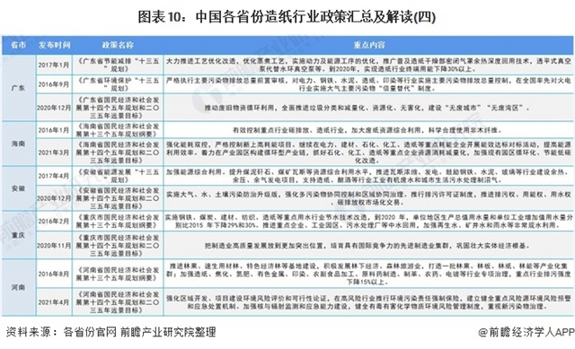 “十四五”期間,我國主要省份也提出了造紙行業(yè)的發(fā)展目標。其中,遼寧省提出要發(fā)展高性能膜材料及制品、可降解生物質(zhì)包裝材料及制品、生態(tài)環(huán)保型生活用紙及紙制品產(chǎn)業(yè);同時貴州也提出要大力發(fā)展酒類防偽包裝、食品包裝等產(chǎn)業(yè);而浙江、海南等地則明確提出要降低造紙行業(yè)高能耗;此外,其他省份也都提出了行業(yè)節(jié)能和綠色化改造的建設(shè)目標或規(guī)劃。