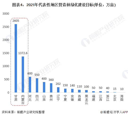 現(xiàn)階段,生態(tài)文明建設(shè)提升到新的戰(zhàn)略高度,造林綠化事業(yè)作為建設(shè)森林生態(tài)系統(tǒng)的主體,造林綠化成改善生態(tài)環(huán)境建設(shè)的重點(diǎn)關(guān)注領(lǐng)域,故此,代表性地區(qū)專門針對(duì)營(yíng)造林綠化建設(shè)提出切實(shí)可行的發(fā)展目標(biāo)。其中甘肅、內(nèi)蒙古地區(qū)營(yíng)造林綠化建設(shè)目標(biāo)均超過(guò)1000萬(wàn)畝。