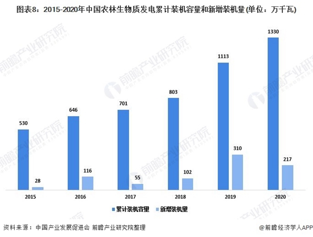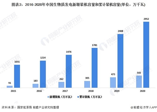 在國家大力鼓勵和支持發(fā)展可再生能源,以及生物質能發(fā)電投資熱情高漲,各類生物質發(fā)電項目紛紛建設投產等推動下,我國生物質能發(fā)電技術產業(yè)呈現(xiàn)出全面加速的發(fā)展態(tài)勢。2020年,生物質發(fā)電新增裝機543萬千瓦,累計裝機達2952萬千瓦。我國生物質發(fā)電裝機容量已經(jīng)是連續(xù)三年列世界第一。