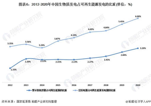 隨著生物質發(fā)電快速發(fā)展,生物質發(fā)電在我國可再生能源發(fā)電中的比重呈逐年穩(wěn)步上升態(tài)勢。截至2020年底,我國生物質發(fā)電累計裝機容量占可再生能源發(fā)電裝機容量的3.2%;總發(fā)電量占比上升至6.0%。生物質能發(fā)電的地位不斷上升,反映生物質能發(fā)電正逐漸成為我國可再生能源利用中的新生力量。