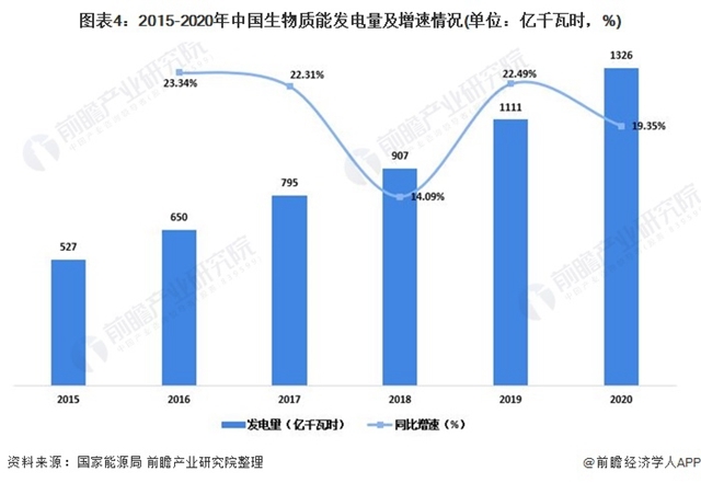 近年來,我國生物質能發(fā)電量保持穩(wěn)步增長態(tài)勢。2020年,中國生物質年發(fā)電量達到1326億千瓦時,同比增長19.35%。
