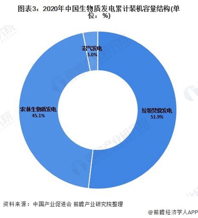 生物質發(fā)電主要包括農林生物質發(fā)電、垃圾焚燒發(fā)電和沼氣發(fā)電。2020在,在我國生物質發(fā)電結構中,垃圾焚燒發(fā)電累計裝機容量占比最大,達到51.9%;其次是農林生物質發(fā)電,累計裝機容量占比為45.1%;沼氣發(fā)展累計裝機容量占比僅為3.0%。