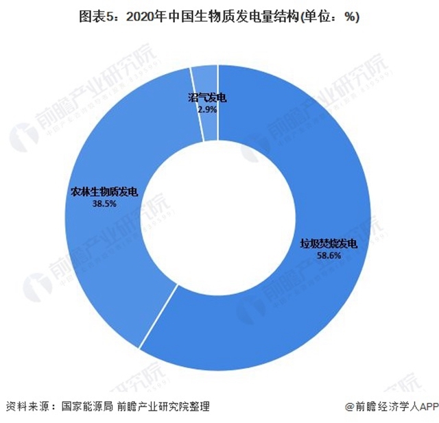 從發(fā)電量結構來看,垃圾焚燒發(fā)電量最大,2020年中國垃圾焚燒發(fā)電量為778億千瓦時,占比為58.6%;農林生物質發(fā)電量為510億千瓦時,占比為38.5%;2020年沼氣發(fā)電量為37.8億千瓦時,占比為2.9%。