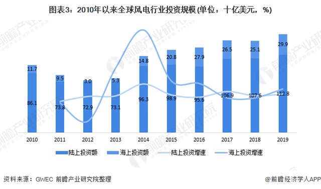 2、全球風(fēng)電場(chǎng)投資規(guī)模不斷增長(zhǎng)