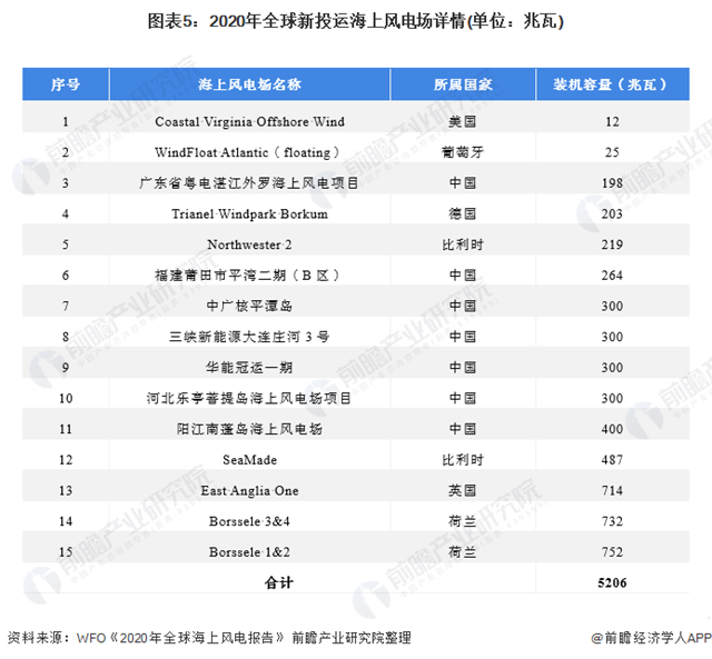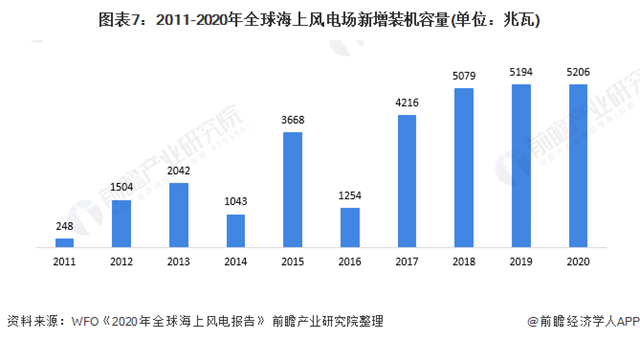海上風(fēng)電場(chǎng)方面,2011年以來,全球海上風(fēng)電場(chǎng)建設(shè)加速,裝機(jī)容量保持穩(wěn)定增長(zhǎng);2018-2020年之間,全球海上風(fēng)電場(chǎng)每年的新增裝機(jī)容量都保持在5000兆瓦以上;2020年,全球海上風(fēng)電場(chǎng)新增裝機(jī)容量5206兆瓦。
