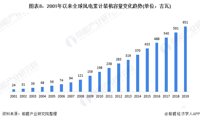 累計(jì)裝機(jī)容量方面,2001-2019年,全球風(fēng)電累計(jì)裝機(jī)容量也不斷增長(zhǎng),至2019年末,已達(dá)651吉瓦,因海上風(fēng)電場(chǎng)累計(jì)裝機(jī)容量占全球海上總裝機(jī)容量的比重達(dá)92.4%,若按90%的占比計(jì)算,全球風(fēng)電場(chǎng)累計(jì)裝機(jī)容量約為585吉瓦。
