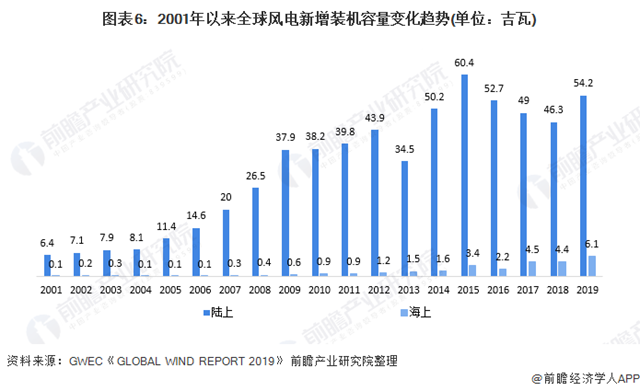 2020年,海上風(fēng)電場(chǎng)累計(jì)裝機(jī)容量占全球海上風(fēng)電總裝機(jī)容量的比重達(dá)92.4%,從全球風(fēng)電總裝機(jī)容量來看,2001年以來,全球新增風(fēng)電裝機(jī)容量總體增長(zhǎng),2010年以后,陸上新增裝機(jī)容量波動(dòng)增長(zhǎng),而海上風(fēng)電新增裝機(jī)容量保持平穩(wěn)增長(zhǎng)。2019年,全球新增風(fēng)電裝機(jī)容量合計(jì)達(dá)60.4吉瓦,其中陸上新增容量54.2吉瓦,海上新增容量6.1吉瓦。