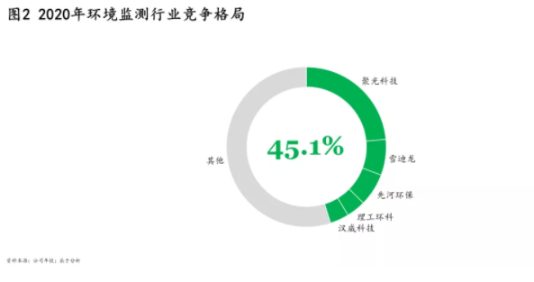 過去幾年內(nèi),國內(nèi)設(shè)備企業(yè)強(qiáng)勢(shì)擴(kuò)張,市場(chǎng)份額持續(xù)提升。外資企業(yè)雖有技術(shù)優(yōu)勢(shì),但由于我國對(duì)相關(guān)設(shè)備國產(chǎn)化的支持,加之國內(nèi)企業(yè)自身的技術(shù)進(jìn)步,優(yōu)勢(shì)不斷下滑。可以看到,為加快環(huán)境監(jiān)測(cè)設(shè)備國產(chǎn)化步伐,國家出臺(tái)多項(xiàng)政策,如《空氣質(zhì)量新標(biāo)準(zhǔn)第二階段監(jiān)測(cè)實(shí)施方案》、《生態(tài)環(huán)境監(jiān)測(cè)網(wǎng)絡(luò)建設(shè)方案》等,鼓勵(lì)國內(nèi)科研部門和相關(guān)企業(yè)研發(fā)具有自主知識(shí)產(chǎn)權(quán)的環(huán)境監(jiān)測(cè)儀器設(shè)備,規(guī)定政府在滿足需求的條件下優(yōu)先使用國產(chǎn)設(shè)備。第三方運(yùn)維企業(yè)以小規(guī)模居多,受數(shù)據(jù)造假、運(yùn)維不規(guī)范、信任危機(jī)等一系列問題影響,部分被淘汰出局。截至2020年,我國環(huán)境監(jiān)測(cè)CR5為45.1%(如圖2),行業(yè)集中度較高。
