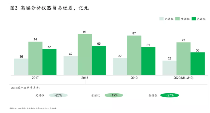 其一,自動(dòng)監(jiān)測(cè)對(duì)儀器設(shè)備提出了更高的要求,外資企業(yè)重獲競(jìng)爭(zhēng)力。當(dāng)前我國分析儀器仍依賴進(jìn)口,近兩年來貿(mào)易逆差雖有所降低,但依然存在數(shù)十億的差距(如圖3)。2018年,光譜儀、質(zhì)譜儀、色譜儀的國產(chǎn)品牌市占率約為20%、15%、27%,差距仍然較大。