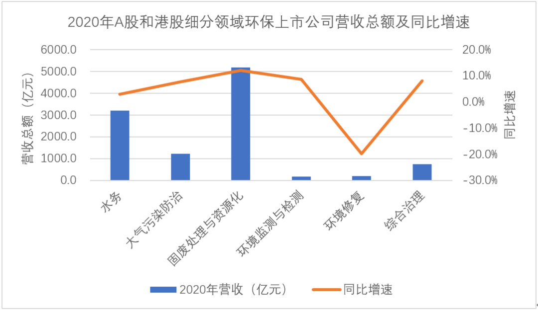 注: 數(shù)據(jù)來(lái)源于Wind數(shù)據(jù)庫(kù),個(gè)別A股環(huán)保上市公司的環(huán)保營(yíng)收難以準(zhǔn)確確定,實(shí)際情況以上市公司發(fā)布為準(zhǔn)。A股和港股環(huán)保上市公司營(yíng)收總額方面:2020年179家環(huán)保上市公司共實(shí)現(xiàn)營(yíng)收總額10717.4億元,同比增長(zhǎng)7.6%,營(yíng)收總額規(guī)模呈現(xiàn)擴(kuò)張態(tài)勢(shì)。其中,120家營(yíng)收(占比67.0%)實(shí)現(xiàn)同比增長(zhǎng),最高增幅106.8%,59家(占比33.0%)營(yíng)收同比下滑,最高跌幅-89.8%。其中,增幅最高的華盛昌,主要得益于防疫相關(guān)檢測(cè)設(shè)備銷(xiāo)售的增長(zhǎng);緊隨其后的德林海營(yíng)收的快速增長(zhǎng)主要得益于藍(lán)藻治理業(yè)務(wù)的增長(zhǎng);偉明環(huán)??偁I(yíng)收整體增幅也超過(guò)50%,其垃圾焚燒設(shè)備、EPC及服務(wù)業(yè)務(wù)營(yíng)收增長(zhǎng)193.02%,垃圾清運(yùn)業(yè)務(wù)營(yíng)收增長(zhǎng)超過(guò)90%。