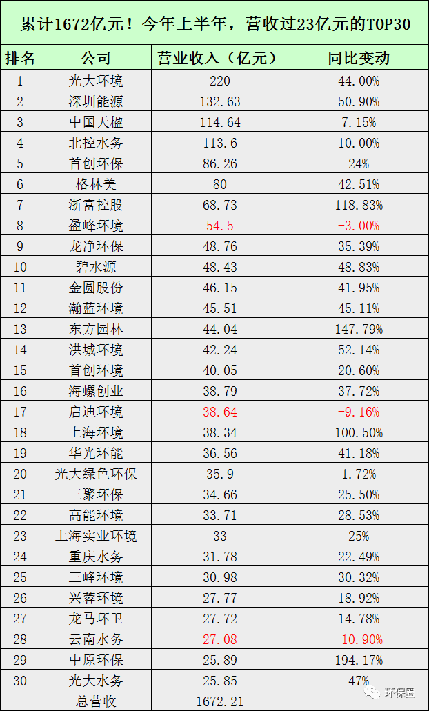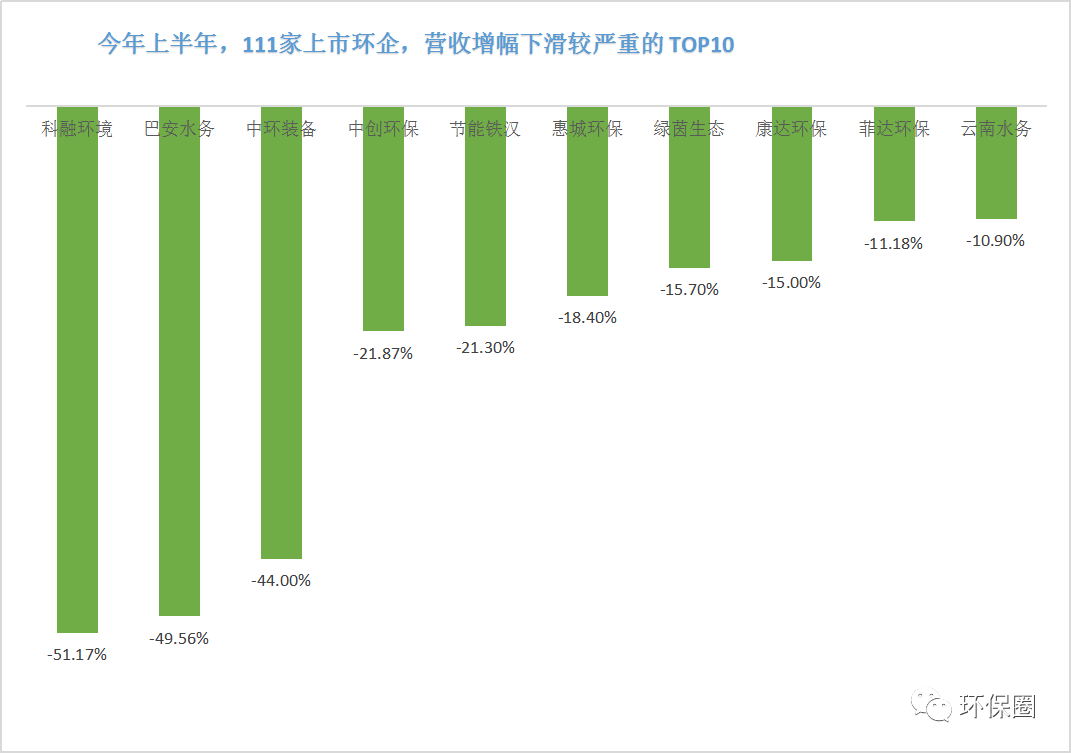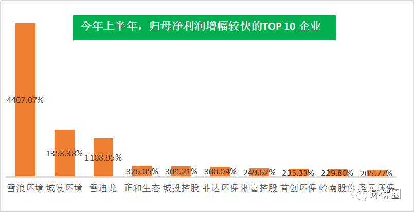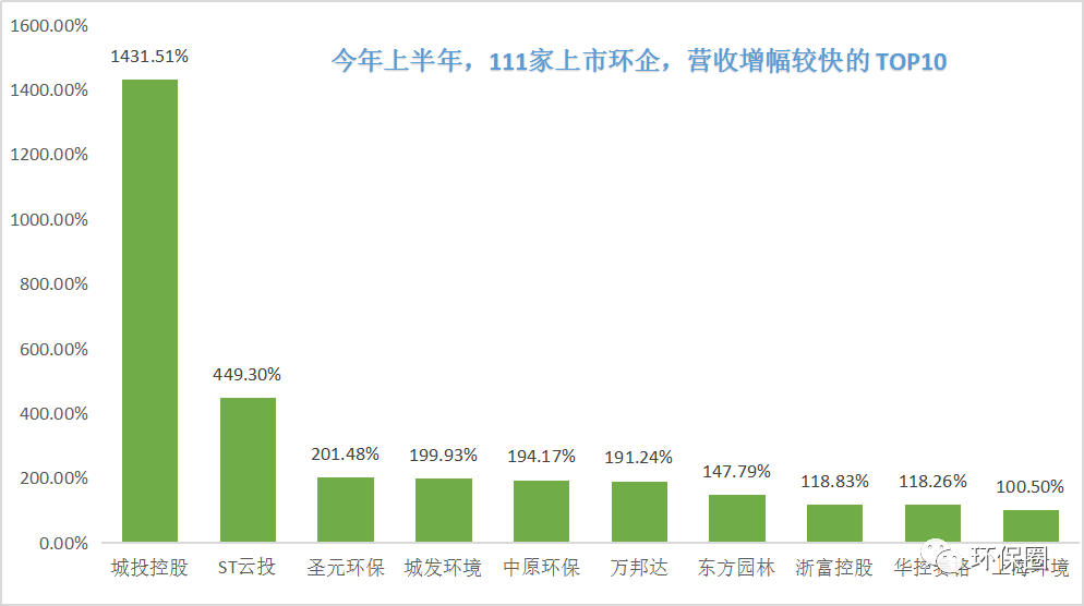 營收變動幅度方面,數(shù)據(jù)同樣喜人。111家上市環(huán)企,除了那些穩(wěn)步連續(xù)增長者,每年總有一些讓人意想不到的“黑馬”企業(yè)率先突圍出來,少則百分之幾百增長,多則百分之上千增長,成為上半年?duì)I收增速最快的10家先鋒企業(yè)。