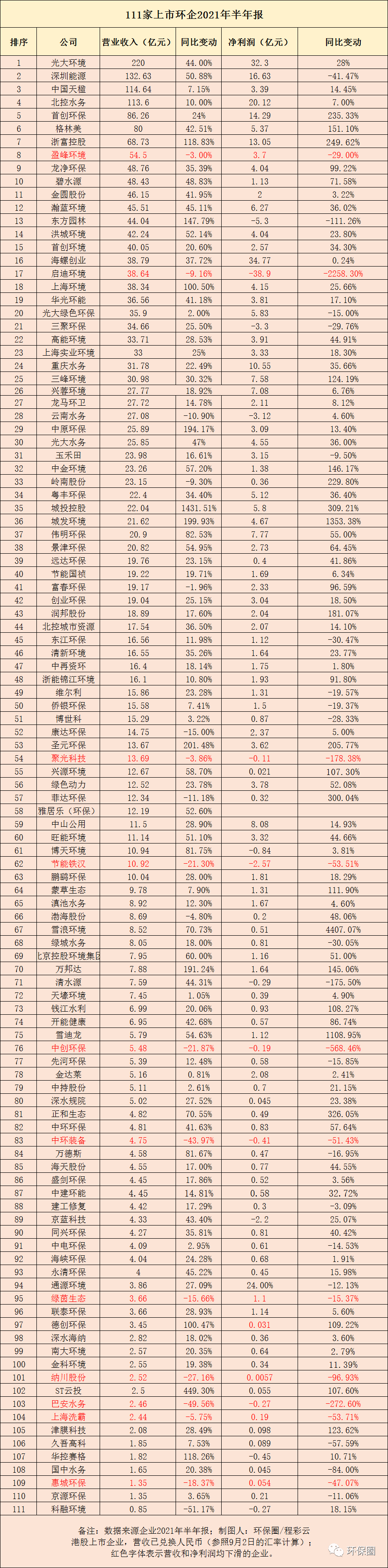 我們先看營收榜。今年上半年,111家環(huán)保上市企業(yè)累計(jì)實(shí)現(xiàn)總營收2443.77億元,相較于去年同期的2000億元,增加了22%,高于預(yù)期。