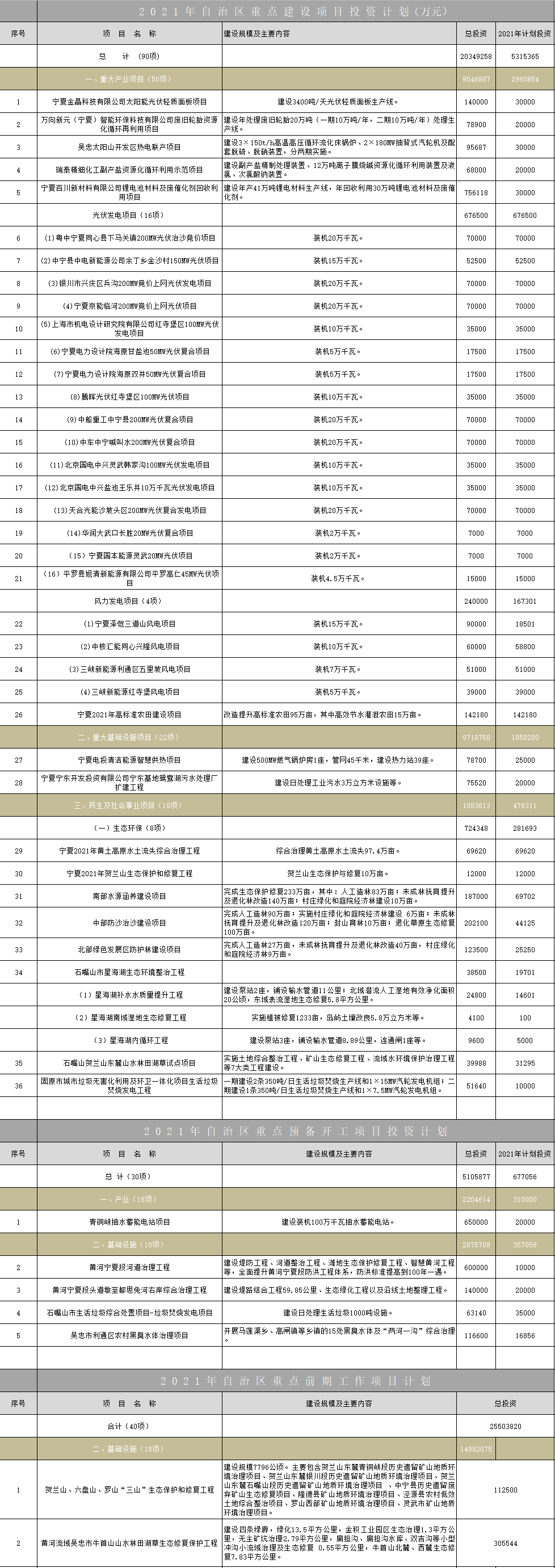 2021年4月7日,寧夏發(fā)布《2021年自治區(qū)重點(diǎn)項(xiàng)目投資計(jì)劃》。 重點(diǎn)項(xiàng)目投資計(jì)劃共計(jì)90項(xiàng),總投資2034.9258億元,2021年度計(jì)劃投資531.5365億元;重點(diǎn)預(yù)備開工項(xiàng)目共計(jì)30項(xiàng),總投資510.5877億元,2021年度計(jì)劃投資67.7056億元;重點(diǎn)前期工作項(xiàng)目共計(jì)40項(xiàng),總投資2...
