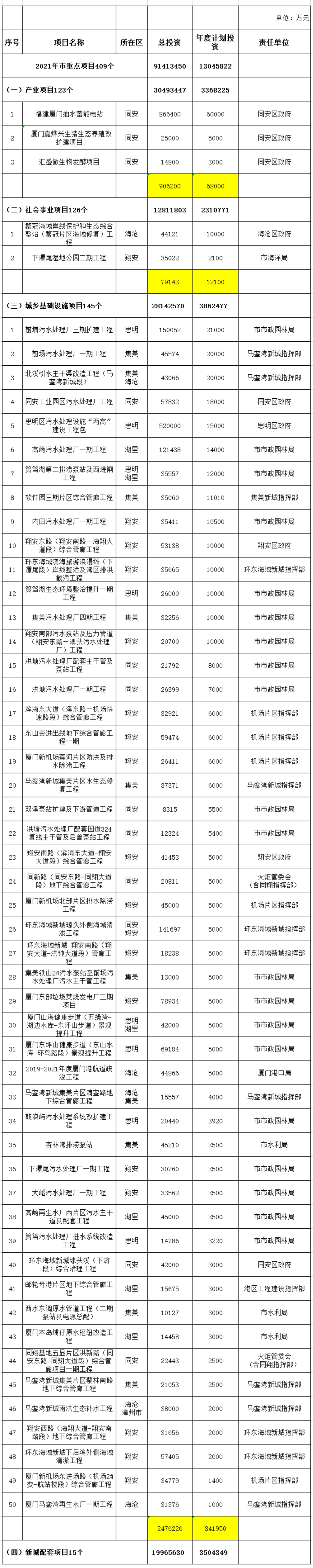2021年1月15日,廈門公開2021年重點(diǎn)項(xiàng)目名單。 2021年市重點(diǎn)項(xiàng)目409個,項(xiàng)目總投資9141.35億元,年度計(jì)劃投資1304.58億元;其中:產(chǎn)業(yè)項(xiàng)目123個,年度計(jì)劃投資336.82億元;社會事業(yè)項(xiàng)目126個,年度計(jì)劃投資231.08億元;城鄉(xiāng)基礎(chǔ)設(shè)施項(xiàng)目145個,年度計(jì)劃投資386....